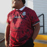 White collar with red trim. Green on Green Aztec Calendar Sublimated front and