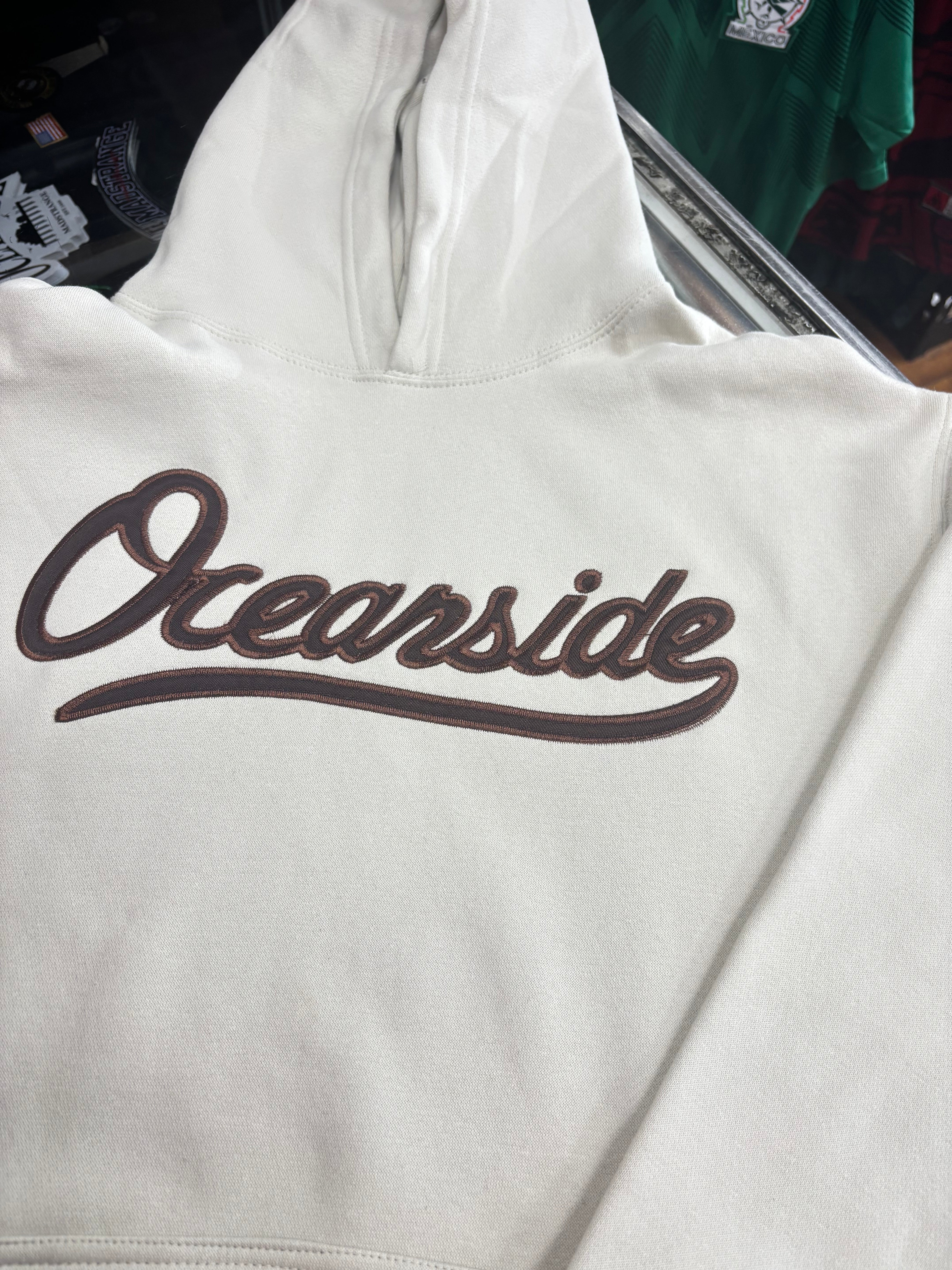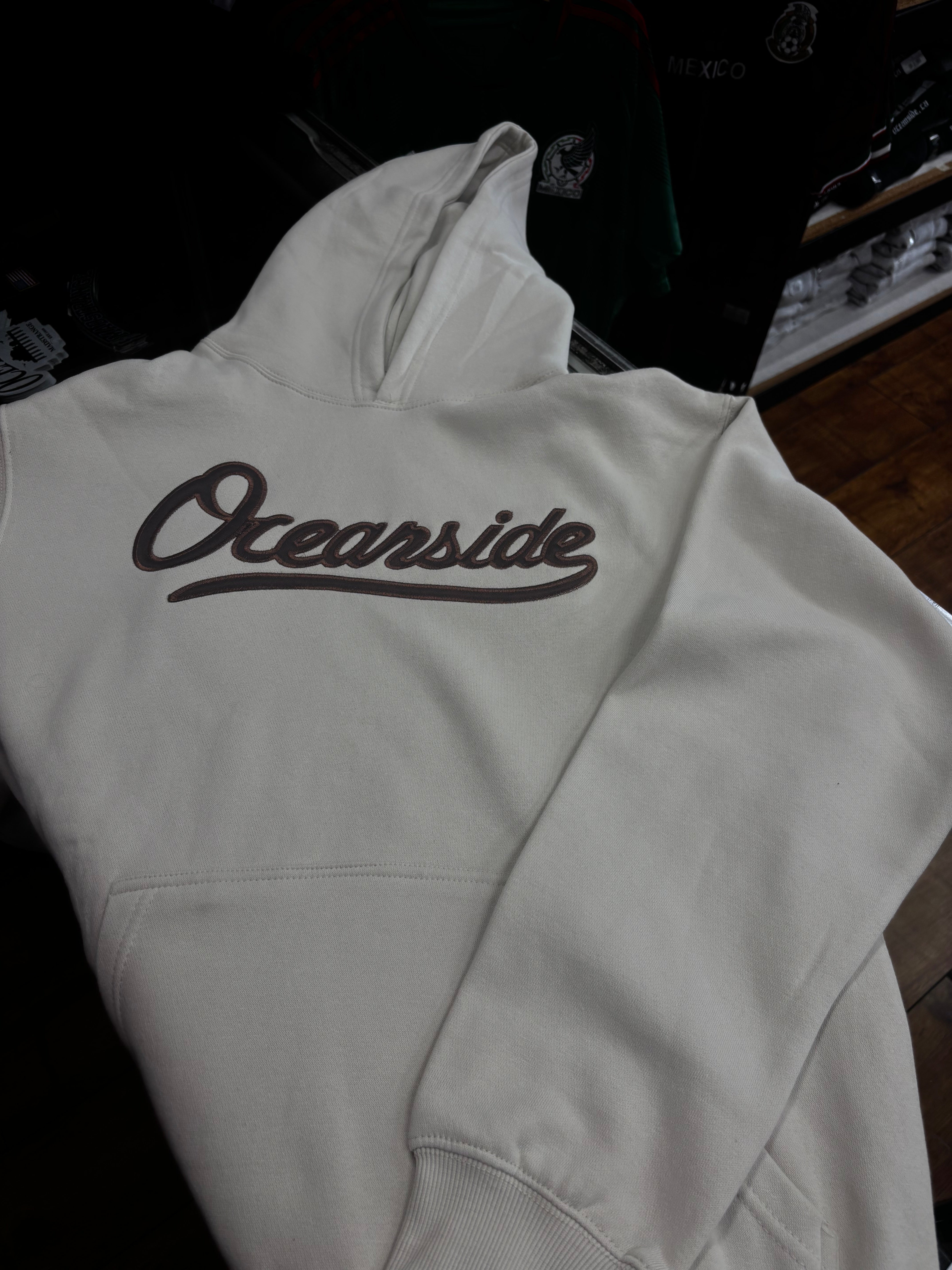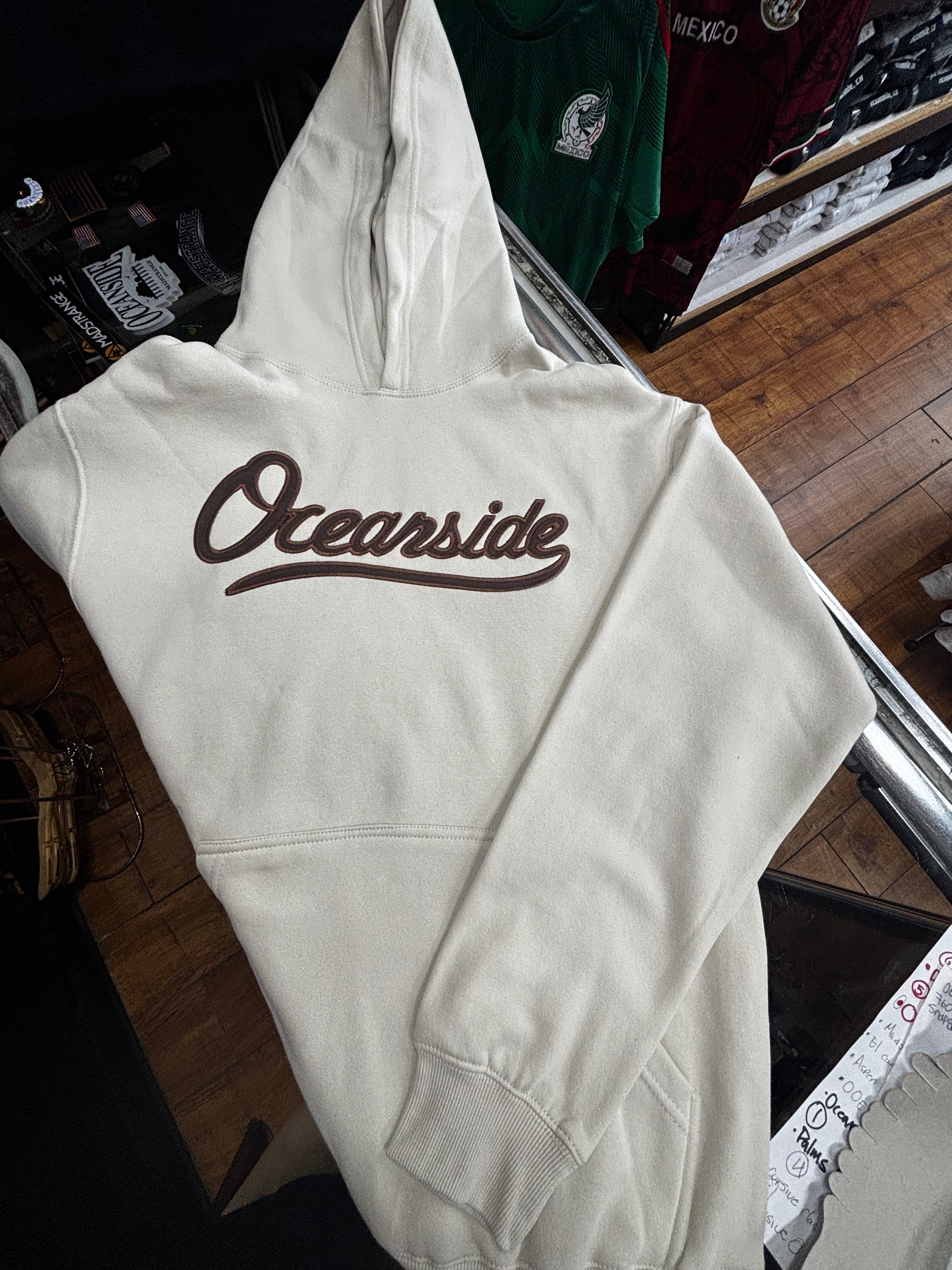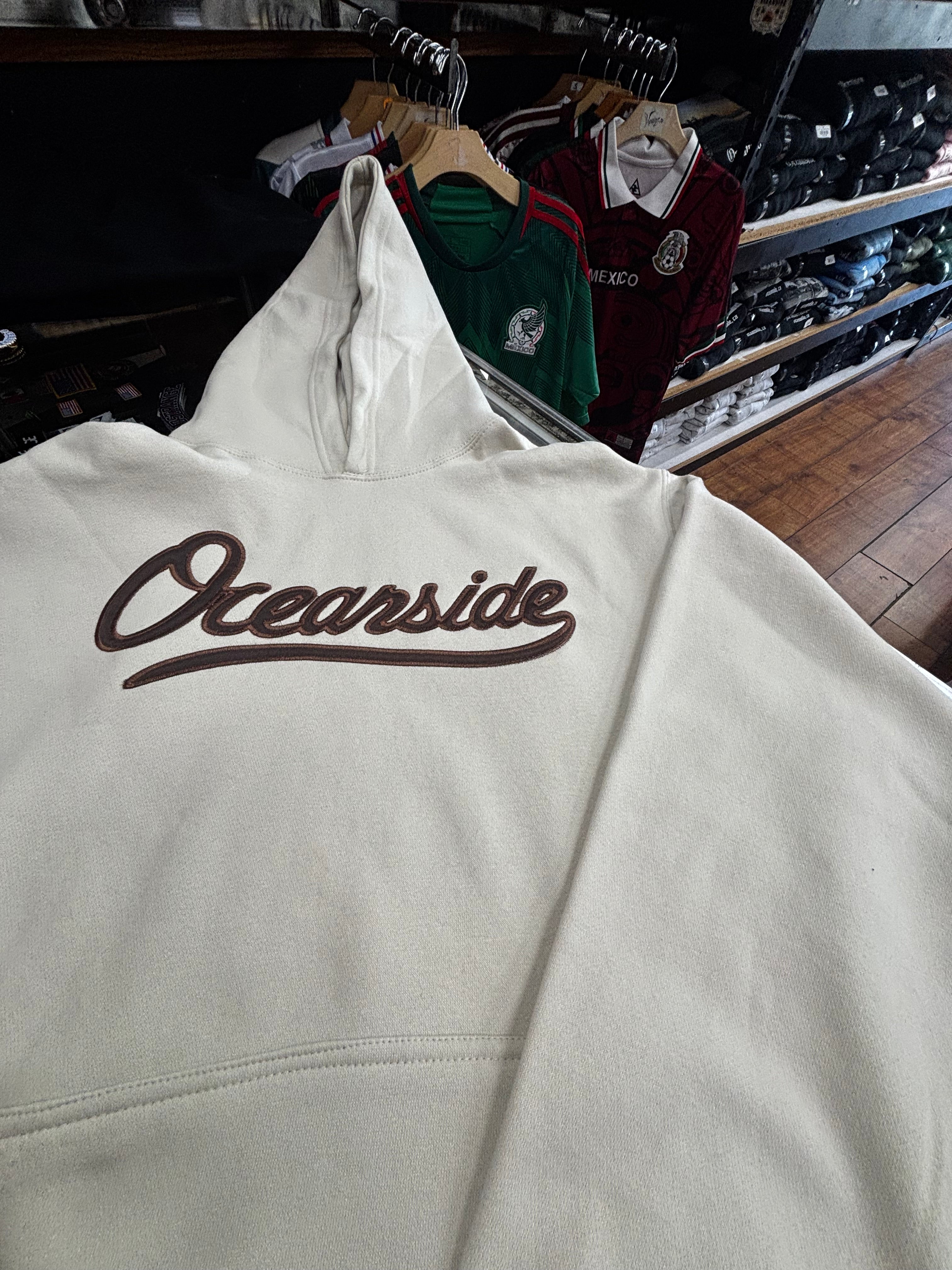 The Classic Hoodie Latte features a creamy base crafted from a heavyweight 60% cotton / 40% polyester blend, delivering cozy warmth and lasting durability. Across the chest, “Oceanside” is embroidered in rich brown classic lettering, adding a refined, understated touch to this everyday essential.