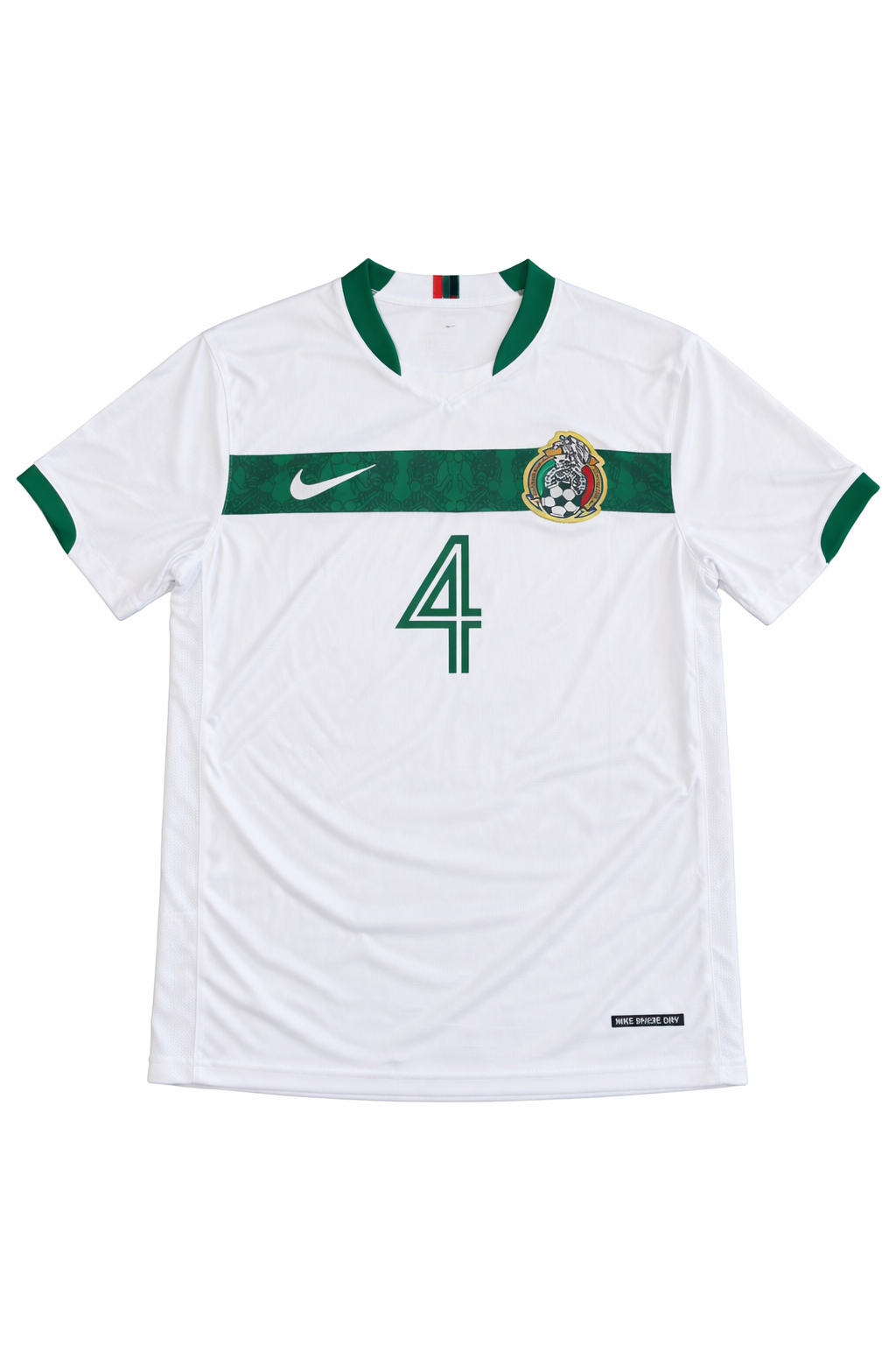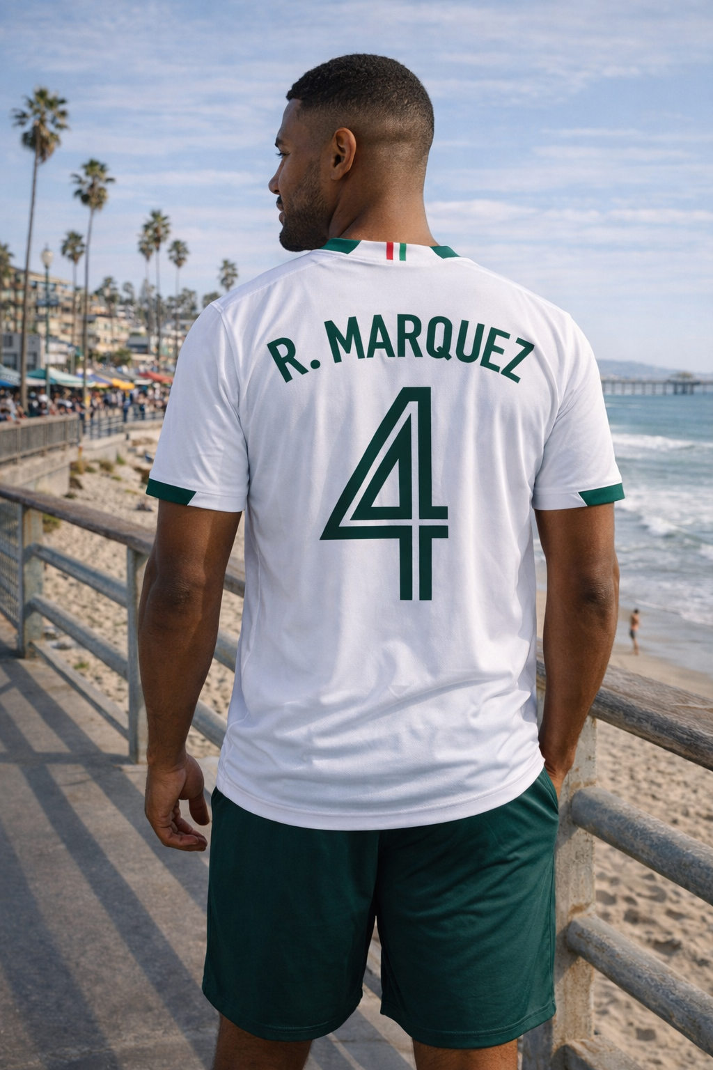 Inspired by the iconic Mexico national team style, this white fan jersey features a clean design with a green Aztec-inspired chest stripe and classic number detailing. Made from lightweight 100% polyester dri-fit material, it helps wick away moisture to keep you cool and comfortable whether you're watching the game, playing soccer, or wearing it casually. A timeless soccer look built for everyday wear.
