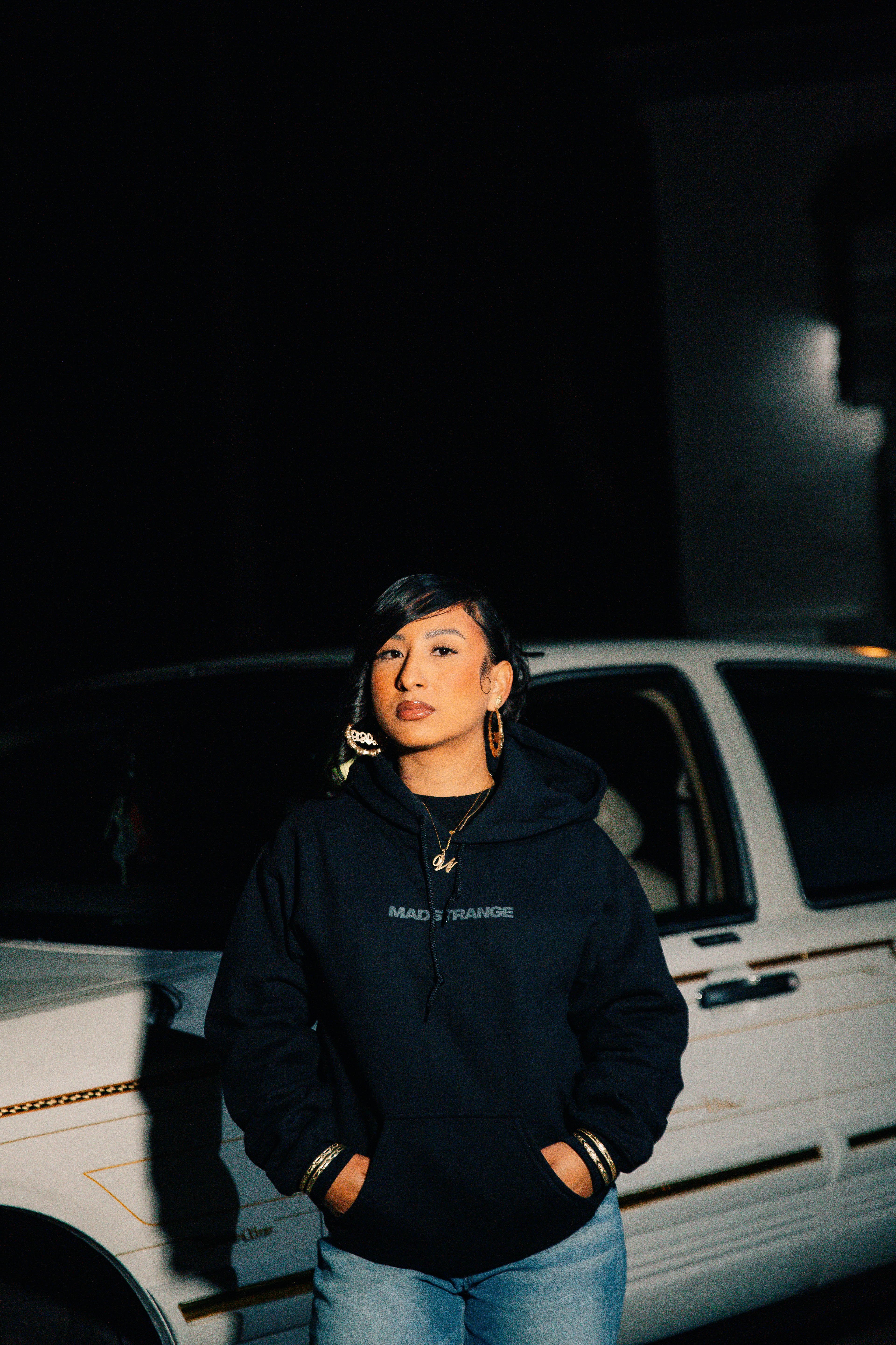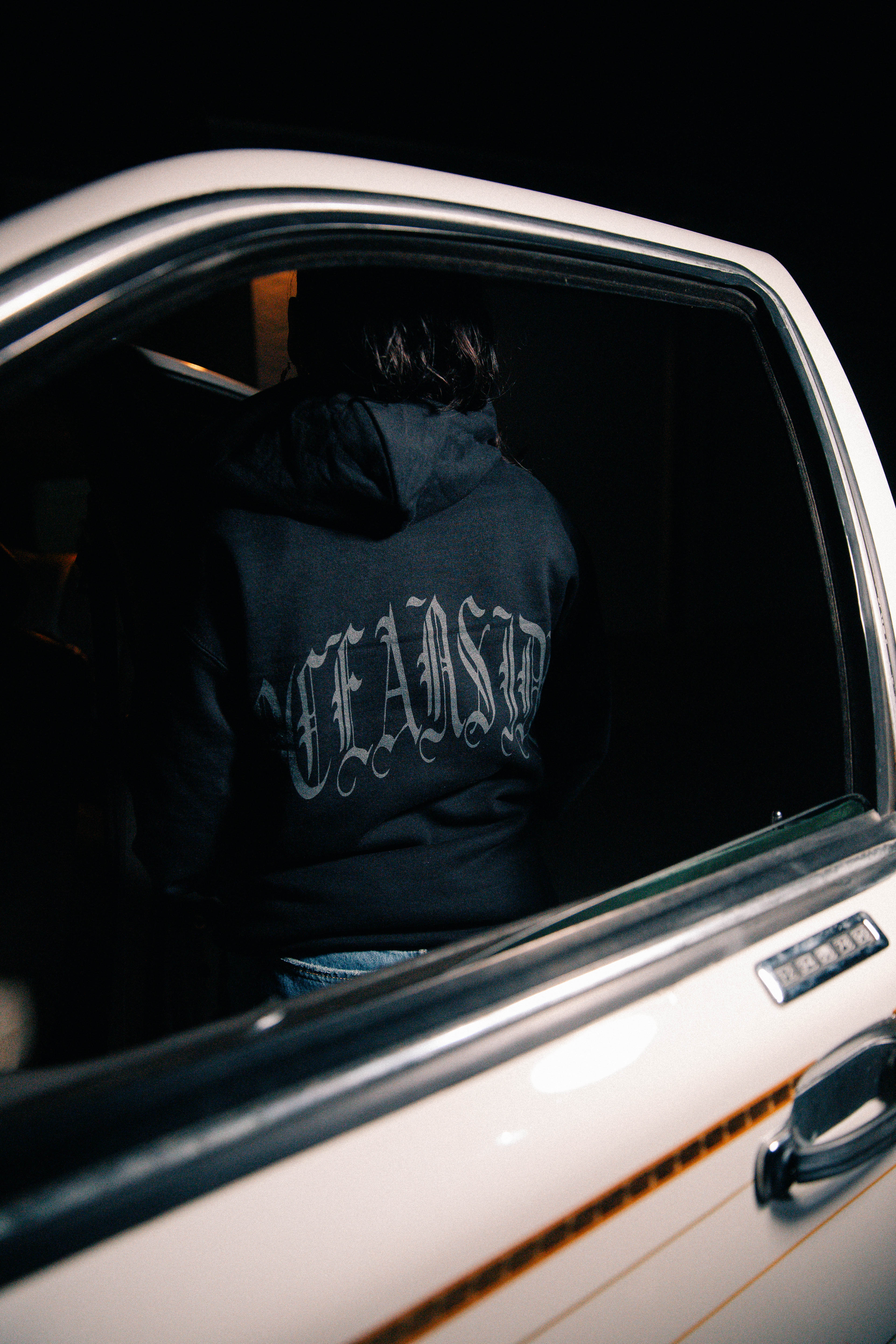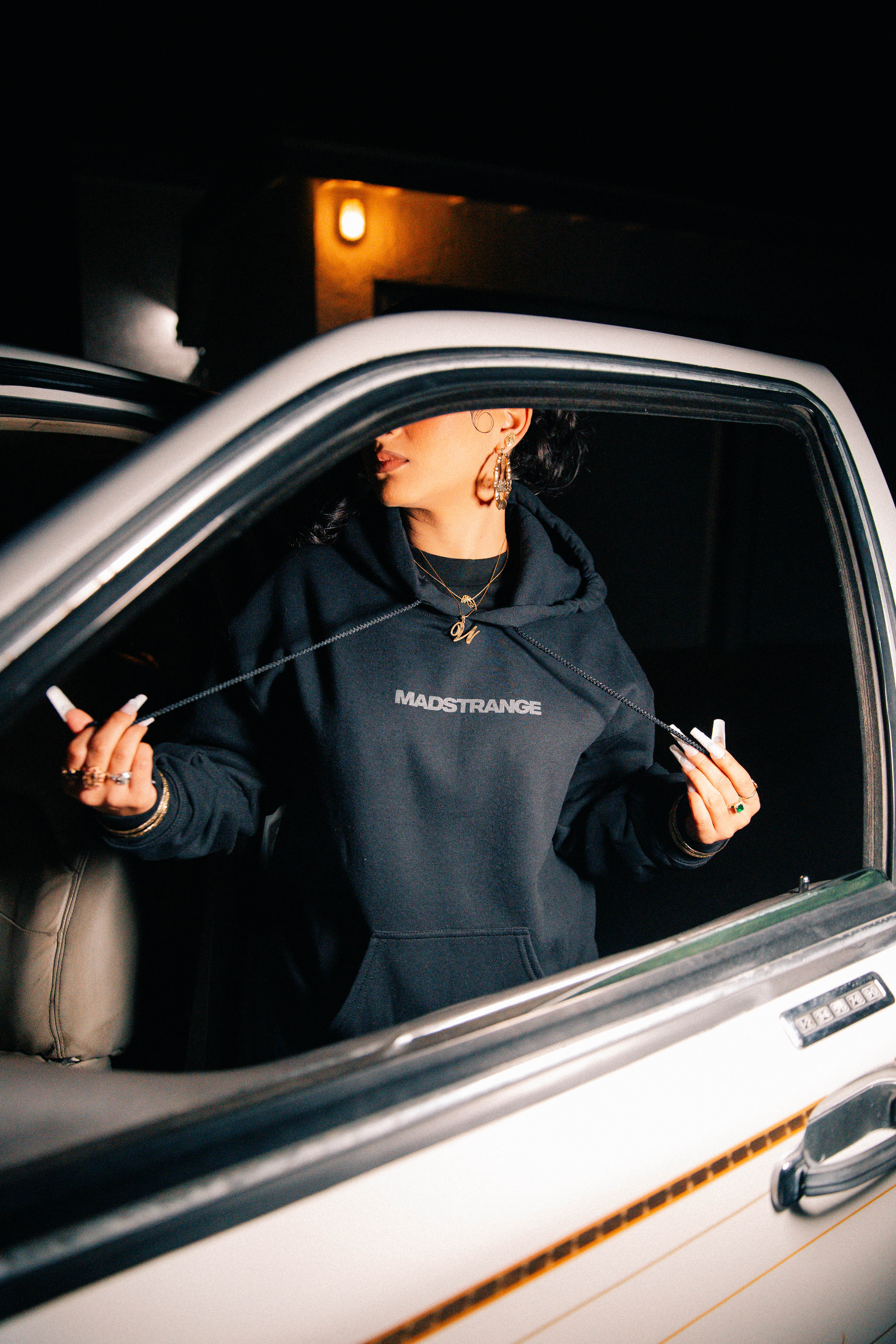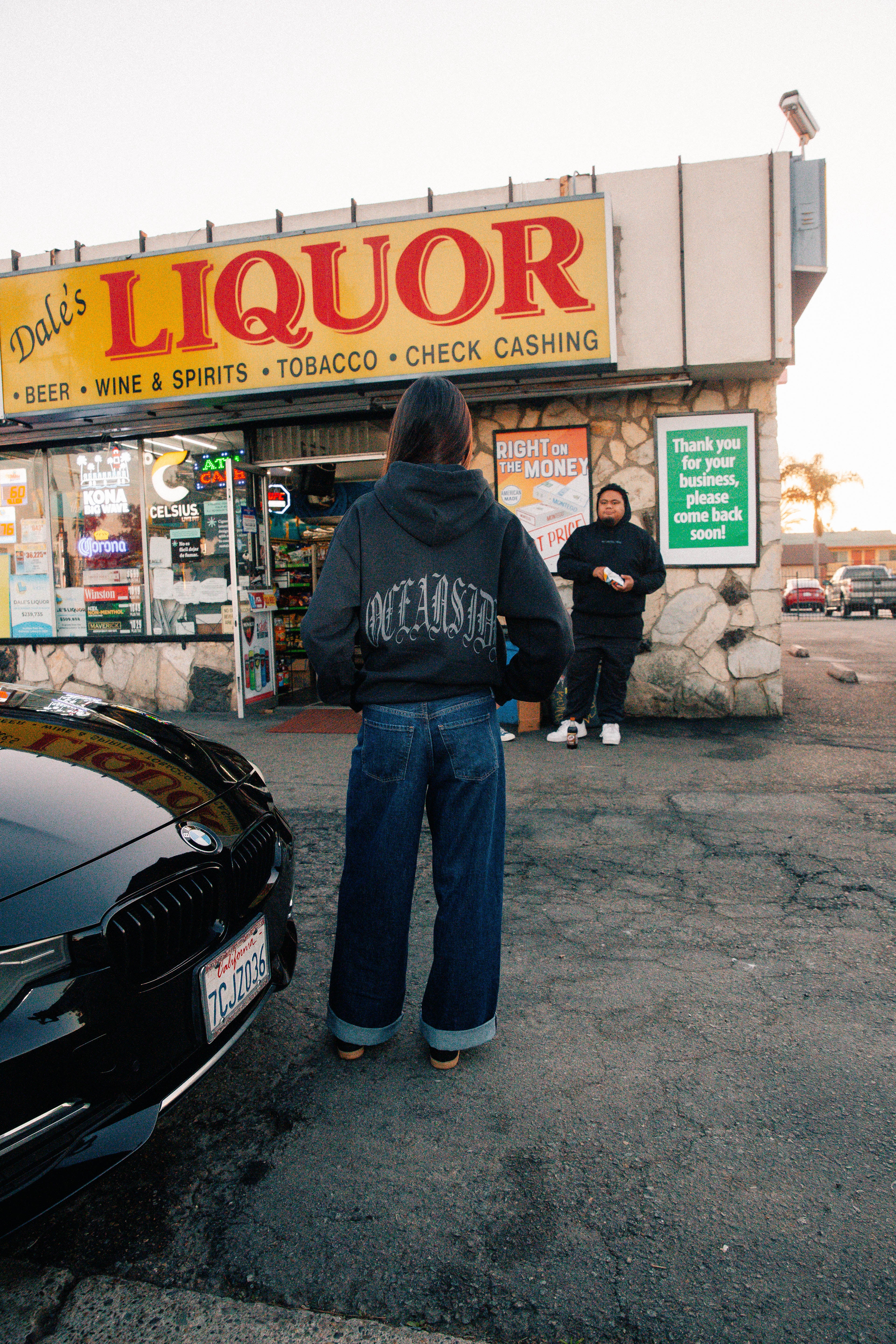 The front keeps things minimal with a clean dark-gray “madstrange” screen print. Across the back, “Oceanside” appears in bold Old English lettering, also in dark gray for a subtle, modern look. A spacious front pocket and sturdy hood round out the classic silhouette, making it a dependable go-to for cooler days.
